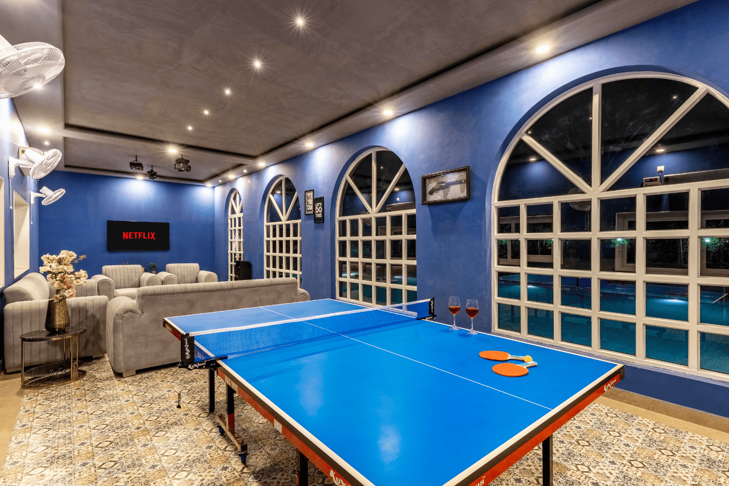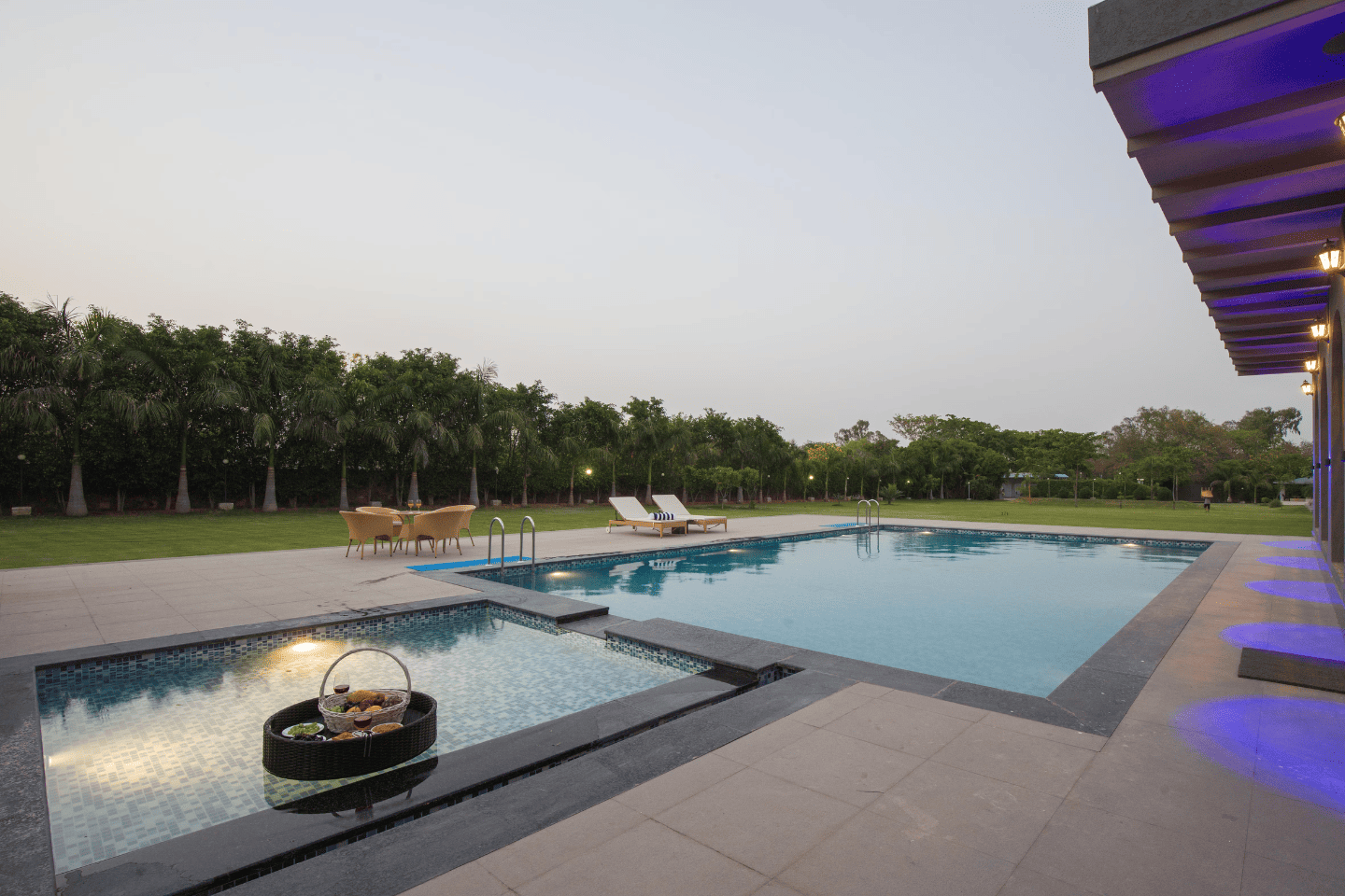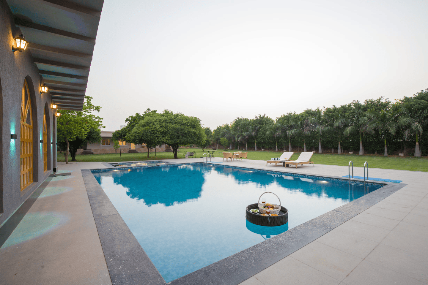 RuYi Travels and Leisure presents the exquisite Enchantia, a luxurious 6-bedroom farmhouse in the serene surroundings of Sohna. This sprawling retreat offers everything you need for a perfect getaway, with a private pool, lush garden, bonfire area, and BBQ facilities for delightful outdoor experiences. The villa features six spacious bedrooms, each equipped with king-sized beds, en-suite bathrooms, and modern comforts like AC and TVs. The living room is designed for relaxation and entertainment, complete with plush sofa sets, a large TV, music system, and a table tennis table. The fully equipped kitchen ensures a convenient and enjoyable cooking experience, while the 8-seater dining table in the garden setting is perfect for intimate meals. The expansive one-acre garden offers ample seating and tranquil spaces for outdoor enjoyment. Whether it's unwinding by the pool, sharing stories around the bonfire, or enjoying a barbecue with loved ones, Enchantia is the ultimate retreat for relaxation and fun.