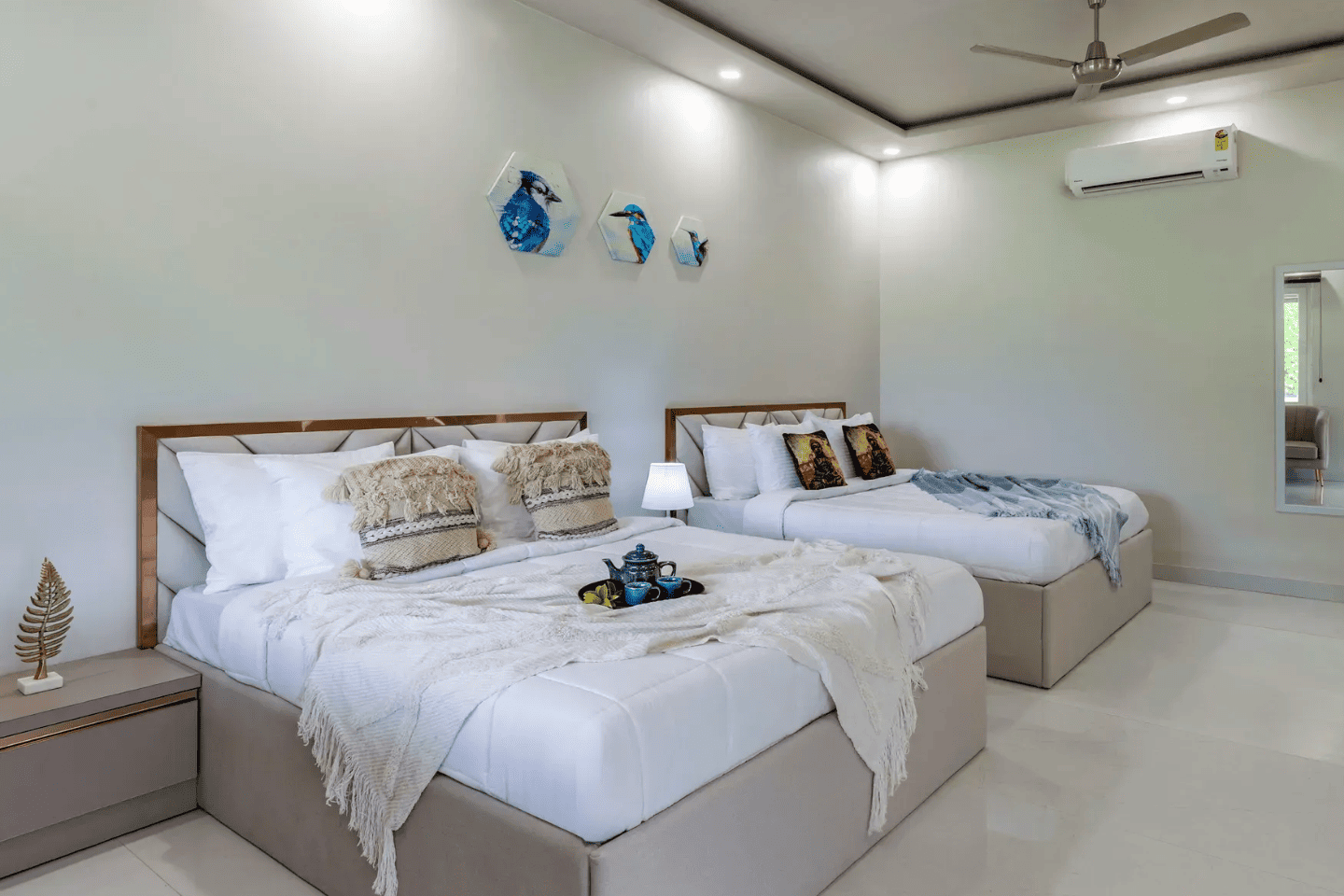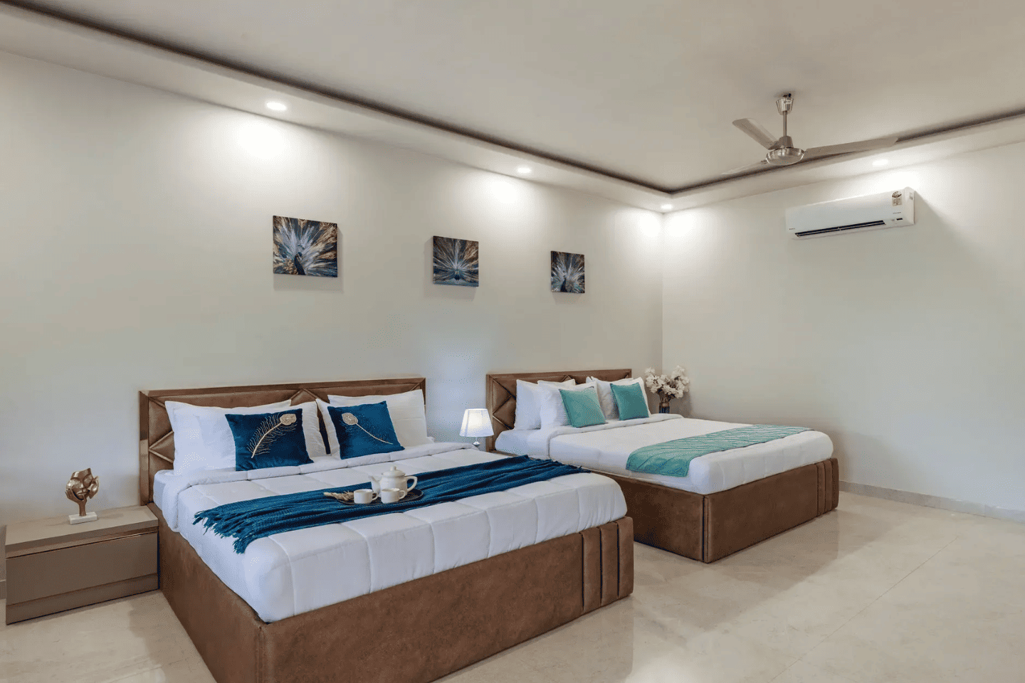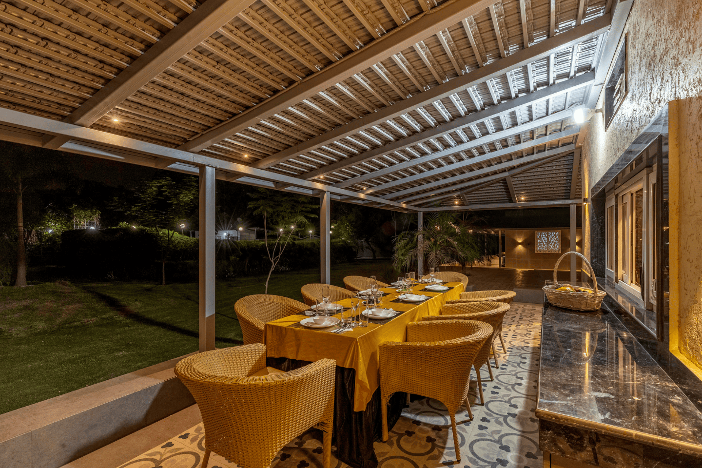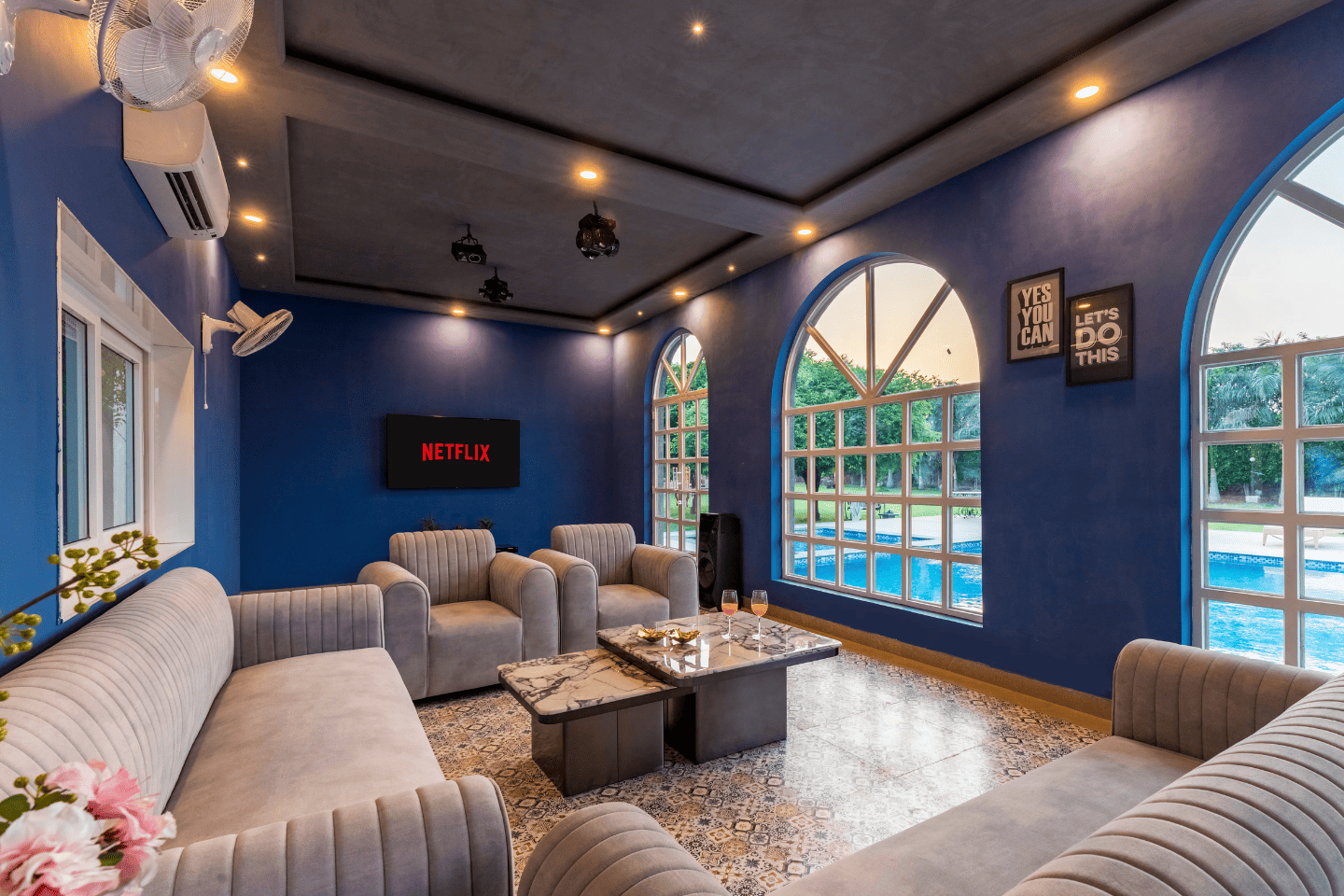 RuYi Travels and Leisure presents the exquisite Enchantia, a luxurious 6-bedroom farmhouse in the serene surroundings of Sohna. This sprawling retreat offers everything you need for a perfect getaway, with a private pool, lush garden, bonfire area, and BBQ facilities for delightful outdoor experiences. The villa features six spacious bedrooms, each equipped with king-sized beds, en-suite bathrooms, and modern comforts like AC and TVs. The living room is designed for relaxation and entertainment, complete with plush sofa sets, a large TV, music system, and a table tennis table. The fully equipped kitchen ensures a convenient and enjoyable cooking experience, while the 8-seater dining table in the garden setting is perfect for intimate meals. The expansive one-acre garden offers ample seating and tranquil spaces for outdoor enjoyment. Whether it's unwinding by the pool, sharing stories around the bonfire, or enjoying a barbecue with loved ones, Enchantia is the ultimate retreat for relaxation and fun.