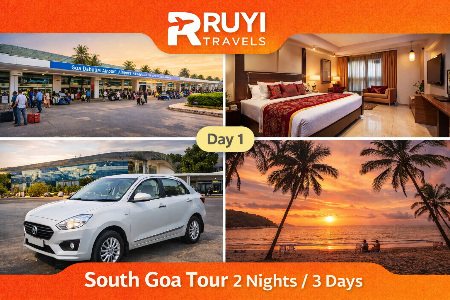 - 2 Nights stay in AC Room 2 Breakfast & 2 Dinner Airport Pickup (Swift Dzire – 4 Seater) Airport Drop (Swift Dzire – 4 Seater) South Goa Sightseeing – Private Extreme South Goa Beach Tour – Private.